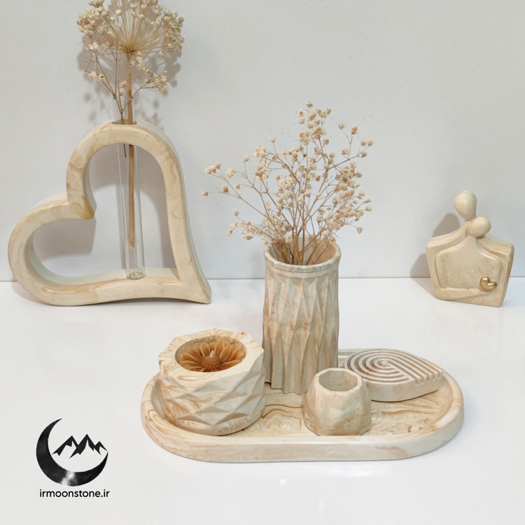 سینی بیضی و شات شمع از جنس سنگ مصنوعی و ضد آب هستند.